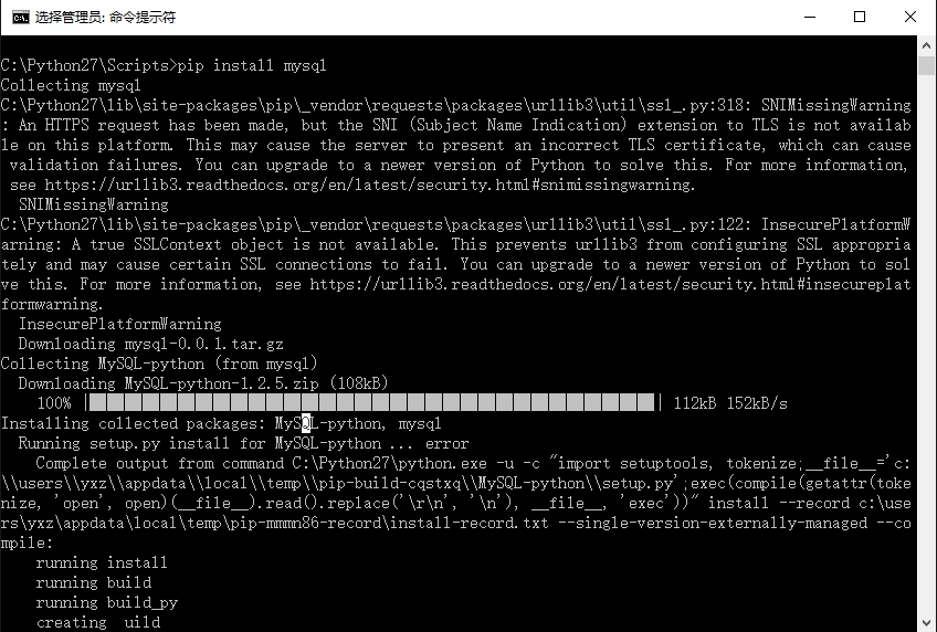 通常的安装方法是使用:pip install mysql 安装Python的MySQL库,但是总会报错。常见错误如: