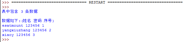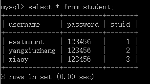 >>> 插入数据: esatmount 123456 1 yangxiuzhang 123456 2 xiaoy 123456 3 yxz 111111 10 >>>