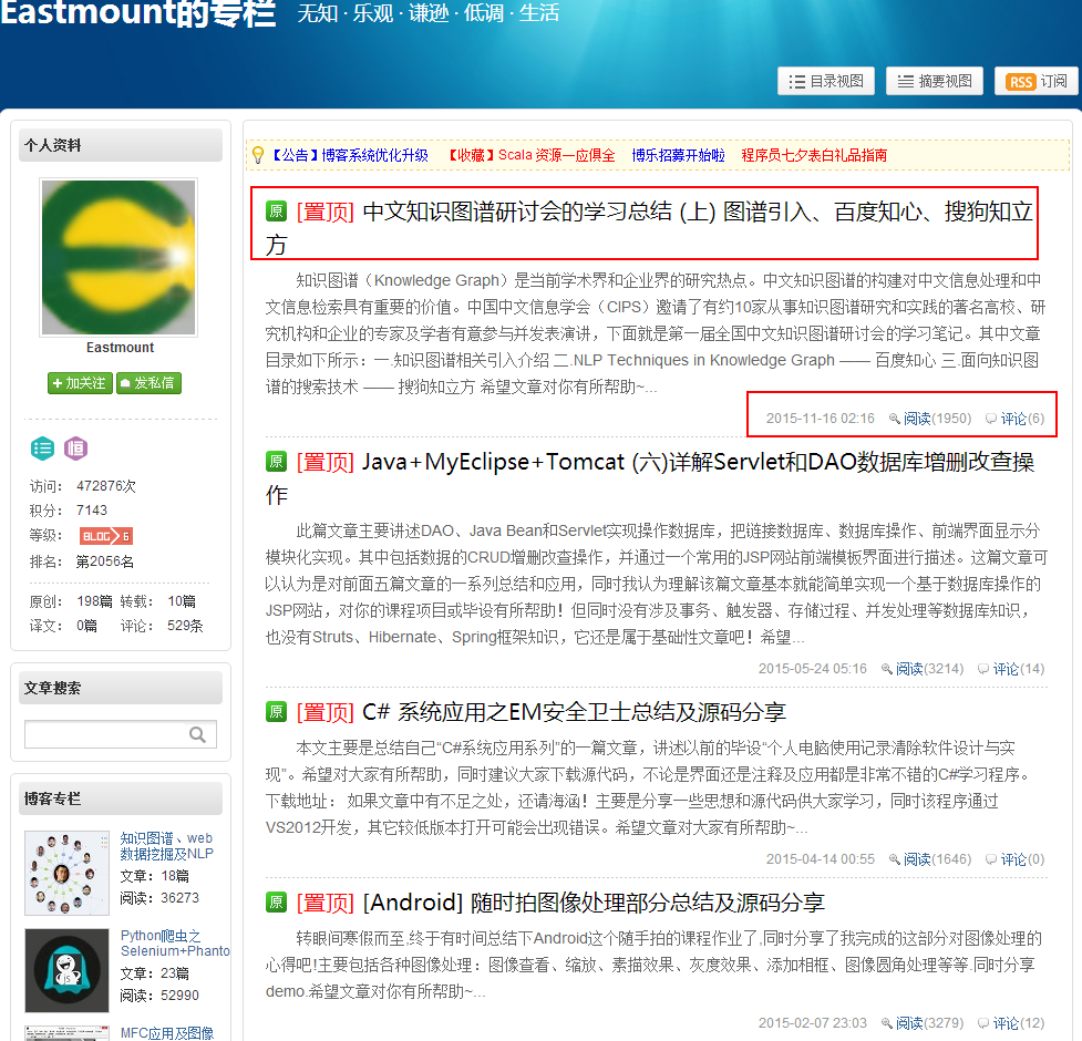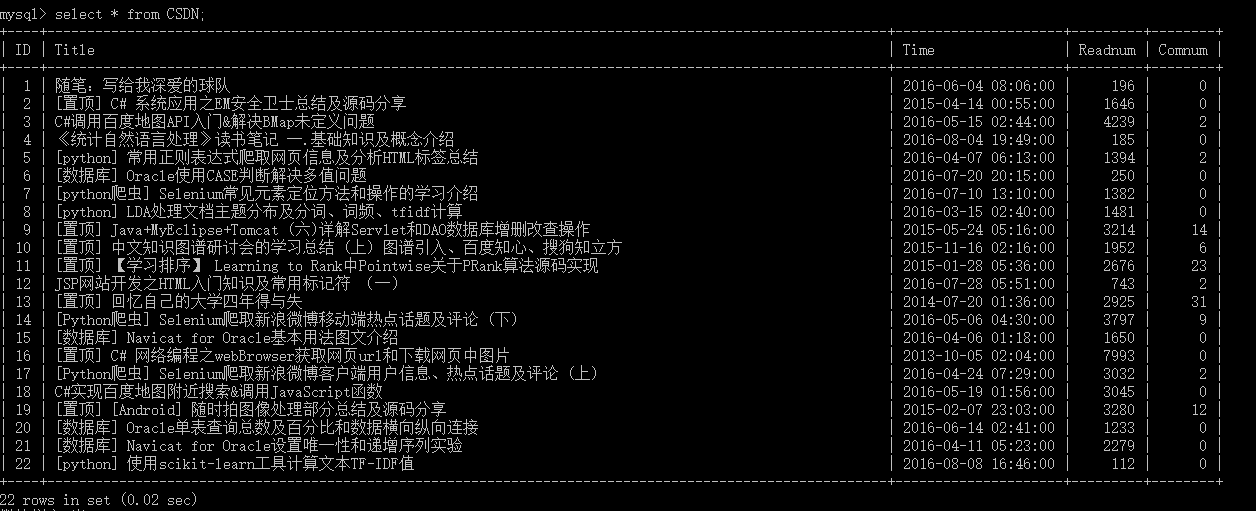 后面我会结合Python爬虫讲述,如何将爬取的内容存储在数据库中,如我CSDN的博客,爬取博客标题、发布时间、阅读量和评论数。