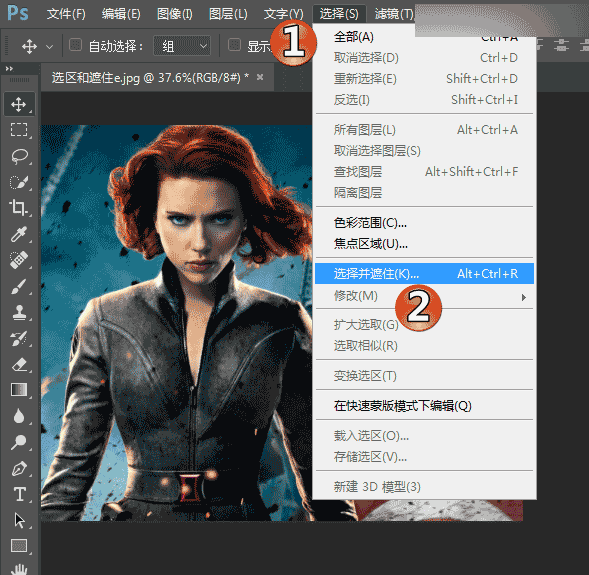 “选择并遮住…”(不知道为啥翻译成了遮住这么直白,人家明明是“选区与蒙版”的说)