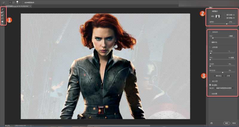 如下图所示,抠图的时候,红圈1和红圈2相互配合可以非常迅速的抠出如下效果(基本就是快速选择工具配合视图模式的观察,几下就能从复杂背景中把寡姐抠出来了,美队已经被抠走,么么哒),然后,再通过红圈3处的参数调整细节,最后点击确定,完成。整个过程非常之流畅快捷哦,这酸爽才叫智能抠图嘛。