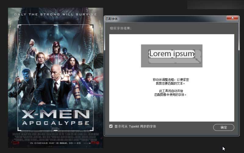 该功能的才做也非常简单,废话不多说,直接上案例,打开一张《X战警:天启》的海报来试验一下,通过菜单栏选择“文字>匹配字体…”来启动该功能。如图所示: