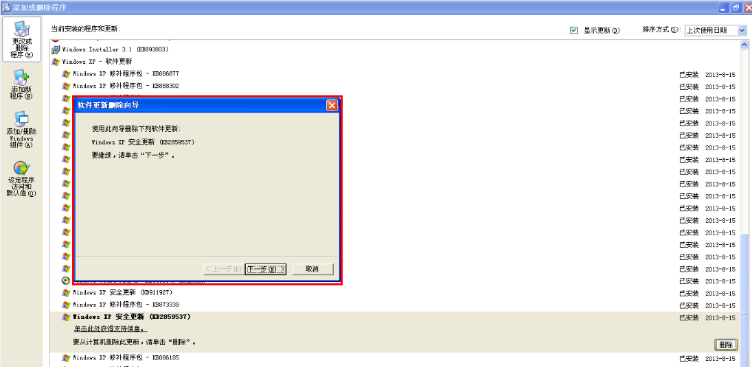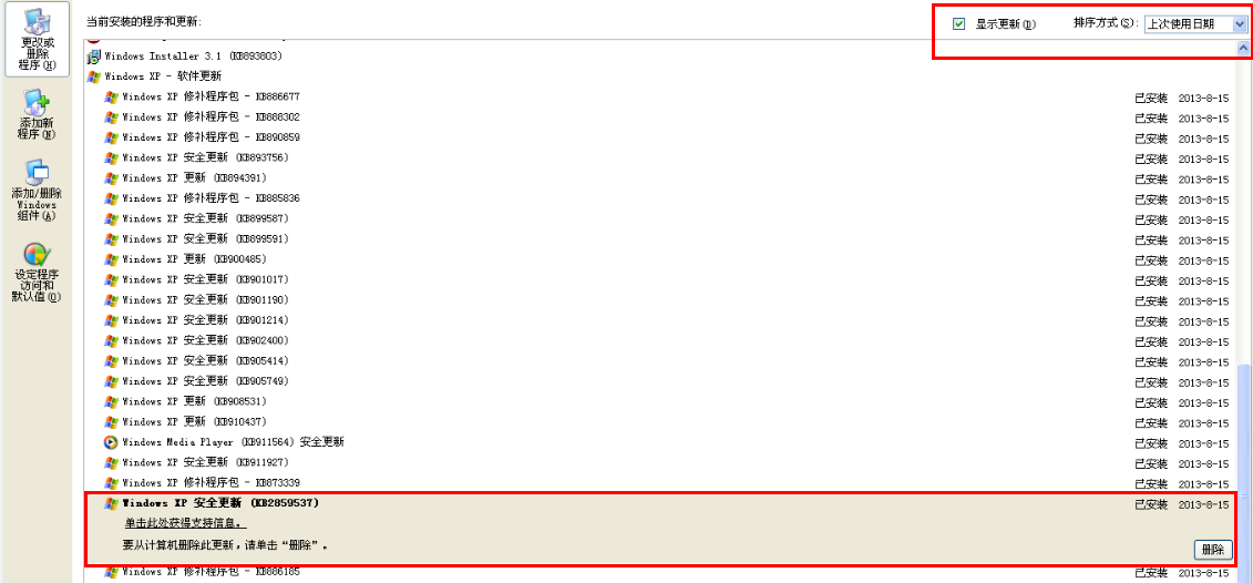 5. 在添加或删除程序页面,勾选“显示更新”--->找到“KB2859537”,选择“删除”;