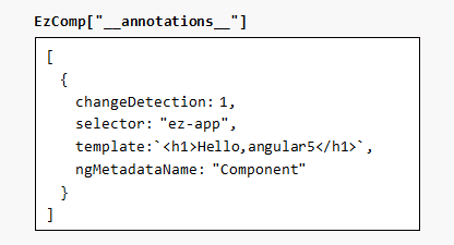 @Component({ selector: "ez-app", template: `<h1>Hello,angular5</h1>`})class EzComp{}