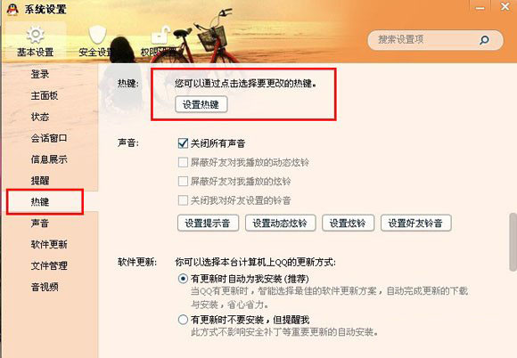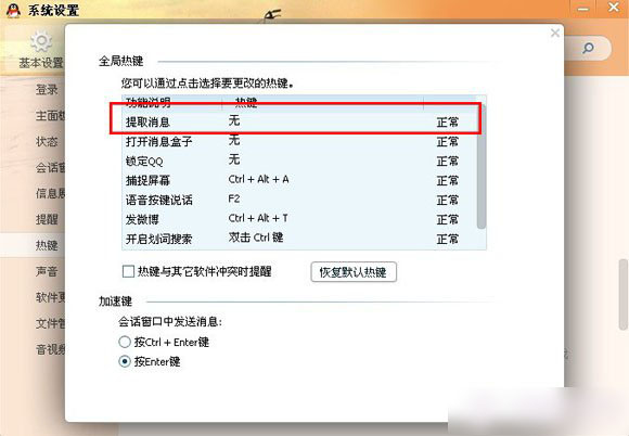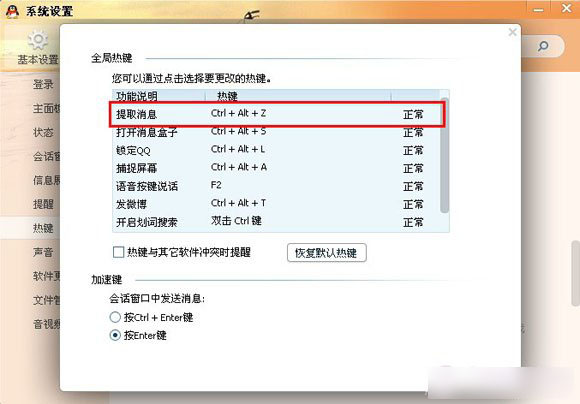 更改QQ热键:我们打开qq左下角有系统设置--基本设置--热键--设置热键如下图