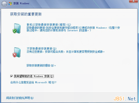 (5) 获取安装的重要更新。安装程序会提示获取安装的重要更新,联网用户可以选择第一项“联机以获取最新安装更新”,这是系统推荐的。没联网用户可选择第二项“不获取最新安装更新”,如图(2)所示: