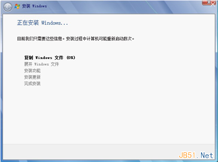 (9) 重启计算机后继续安装。安装程序复制一些文件后,系统自动重启,将进入Win7安装继续复制文件和展开文件,待完成后,系统自动再次重启。