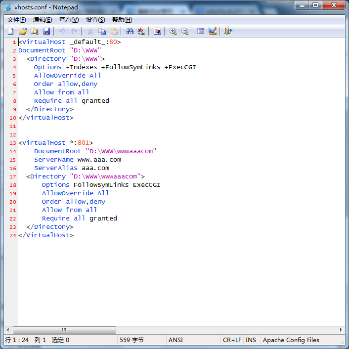 第三步在apache的配置文件vhosts.conf中,配置以下内容