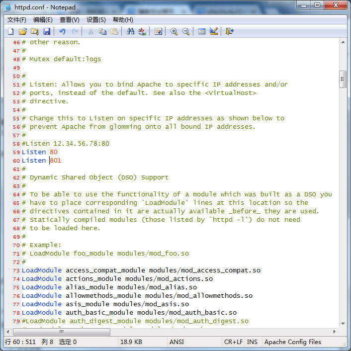 在配置文件http.conf中添加 ,在80后添加新端口号