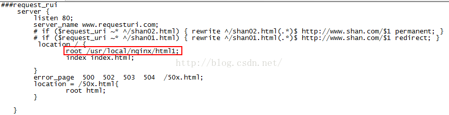 1、www.requesturi.com配置如下:发现root目录与error日志中的禁止访问的文件不一致,理论上访问www.requesturi.com应该到/usr/local/nginx/html1去查找,为何显示的确是/usr/local/nginx/html禁止访问?