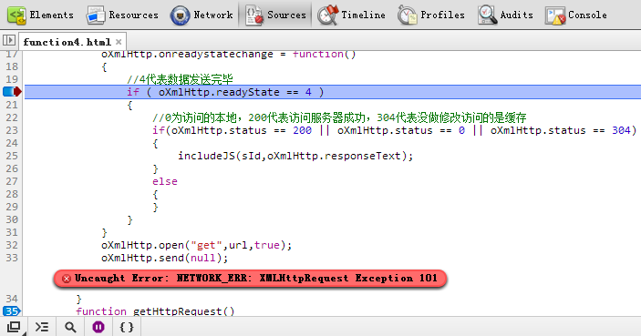 ActiveXObject只有IE里面才有,其他浏览器大部分支持XMLHttpRequest,通过此办法我们可以实现动态加载脚本了,不过是异步加载,也没法运行functionOne,第二次就可以运行了,但是可惜的是在IE、Firefox、Safari下可以运行,在Opera、Chrome下会出错,Chrome下的错误如下: