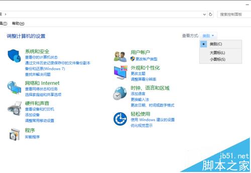 2、打开控制面板,将右上角的查看方式由缺省的<类别>下拉改为《小图标》,如下图所示。