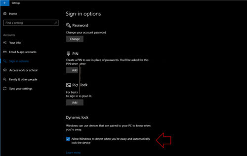当您离开时,Win0可以自动锁定您的电脑,保持您的信息安全。如果您忘记自己锁定设备,Windows将通过咨询您的手机为您提供保护。该功能是Windows 10 Creators Update引入的,并标有“动态锁定”。