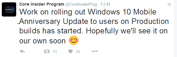 8月11日消息,相对可靠的推特用户Core Insider Program今天为我们带来的最新的Win10 Mobile一周年更新正式版推送的消息,虽然推文内容不多,但对于WP手机用户是个好消息。