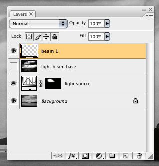 9、关闭“基础光线图层”。选择“光线1”图层。按下Ctrl+T对图层进行自由变换,拖动底部居中的手柄,使其一直伸展至图片中船所在的位置。现在按住Ctrl键同时将相同的手柄向右拖动,使其刚好处于船的下方。按住Ctrl+Shift键,向外拖动左下和右下的手柄直到得到一个让你满意的形状。