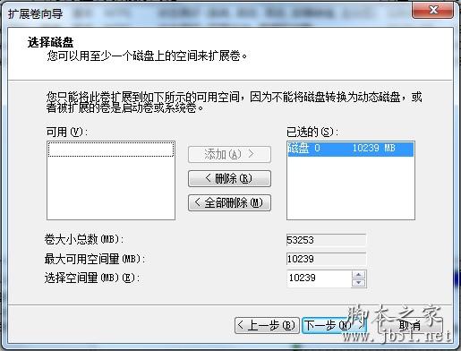 步骤三、现在会将一个10GB的可用空间在磁盘列表显示出来,如果需要将这10G压缩卷合并到其他的磁盘的话,比如C盘吧。右击c盘选择“扩展卷”即可执行扩展卷向导窗口,选择可用空间10GB的磁盘,再点击“下一步”即可。如图所示: