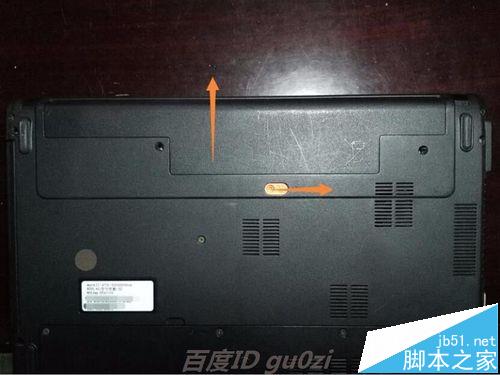 1、关闭宏基Acer Aspire E1-471G笔记本,拔掉电源线,翻转主机到背面,用小螺丝刀往右推动电池的固定卡勾,取下电池,
