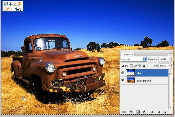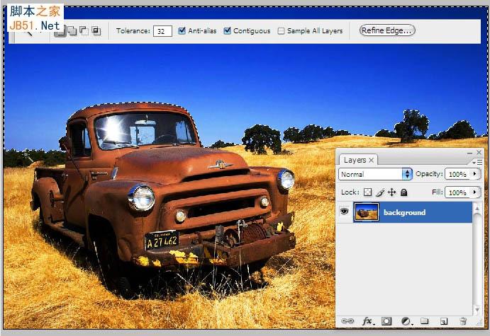 3、重复以上步骤于‘grass&tree’与‘car’。选中‘sky’图层,使用魔术棒(W)选中底部区域,你会发现‘grass&tree’与‘car’也被选中了。