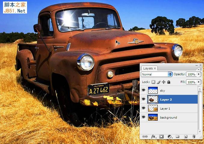1、打开素材,为了体现你很专业,也为了更好的效果,照片可以分成三个图层–‘sky’,‘car’和‘grass&tree’。