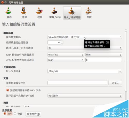 2、点击“输入/编解码器”,在“硬件加速解码”右边选择“VA-API视频解码器,通过x11”即可实现硬件加速播放视频了。
