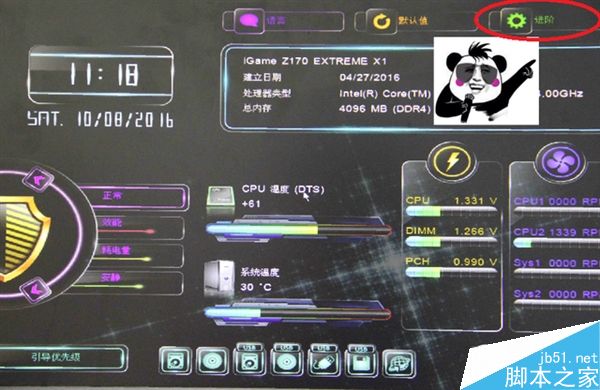 在七彩虹Z170X BIOS简洁模式的BIOS界面上主要包括了系统时间信息,CPU及内存主板型号,CPU及系统温度,风扇及硬件电压数值显示,位于左边的是滚轮式的散热模式选择模块,底部有非常清晰的引导优先级设置,通过鼠标拖动就可以调整。我们点击右上角的进阶按钮。
