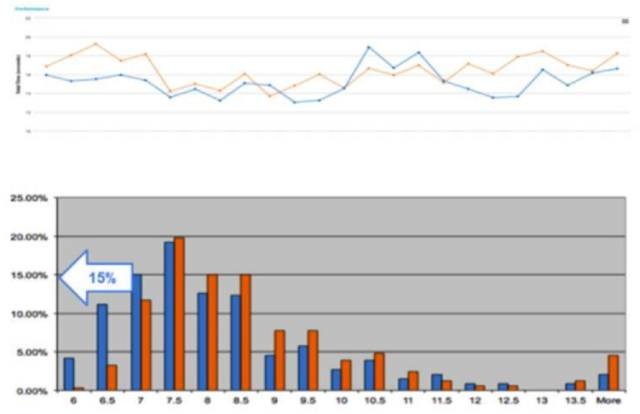 加载时间小于7秒的所有用户(包括6秒、6.5秒和7秒)的占比总和,蓝色比橙色多了15%。