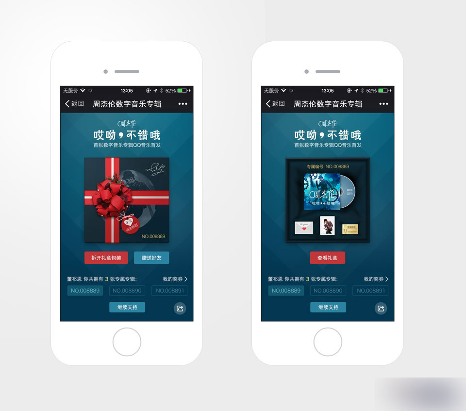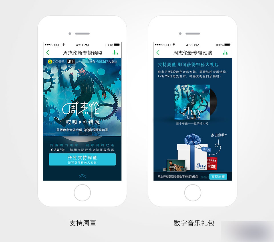 模版化周杰伦数字音乐专辑只是开端,为了应对更多的数字音乐专辑的售卖,我们将活动流程规范化,页面的设计模板化,以节省人力成本。经过了苏打绿、bigbang、周笔畅等多张数字音乐专辑的慢慢调整, 数字专辑售卖的模块已经基本完成模板化。当然,为了迎合各类粉丝的喜好以及不同专辑的风格,每个专辑的礼盒,在保持一致性的同时我们会做一些差异化的设计,使每个专辑能有自己的特色。