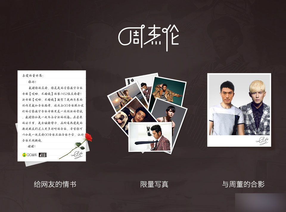 在一张精美的实体专辑中,歌本是一个非常重要的内容,它是精心设计过的,能够帮助大家了解专辑的东西。我们利用数字音乐的富媒体优势,将明星告白、独家MV、私房写真等内容打包,制作成一个完整的H5页面,让用户能够更立体地了解这张专辑。为用户提供一种"稀缺、尊贵、超值、与偶像同在"的体验。
