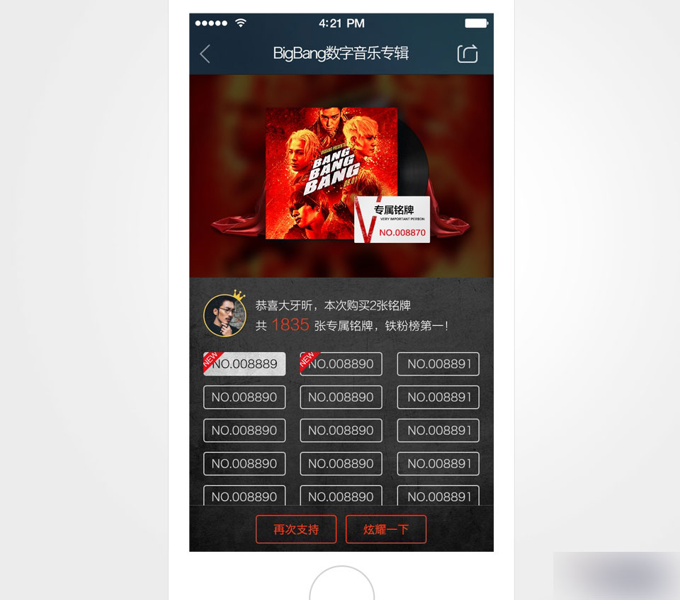 在BigBang的mini专辑一期时,抢靓号铭牌还只是一个小小的引导,在二期,我们将这个优化为一个栏目,实时展示当前号码,以及距离靓号的张数,帮助用户判断购买时机,刺激土豪用户购买。