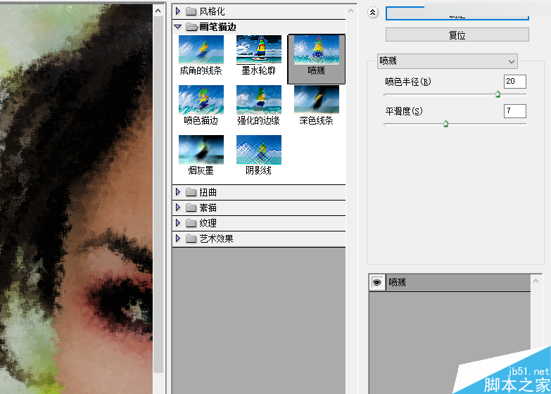 Shift+ctrl+alt+e盖印图层,得到“图层5”,添加蒙版适当的涂抹,并且转化为智能对象,而后执行“滤镜-滤镜库-素描-水彩画纸“命令,在执行“滤镜-滤镜库-画笔描边-喷溅”命令,并设置相应的参数,打开“梦幻光影.png”文件,放到合适的位置。
