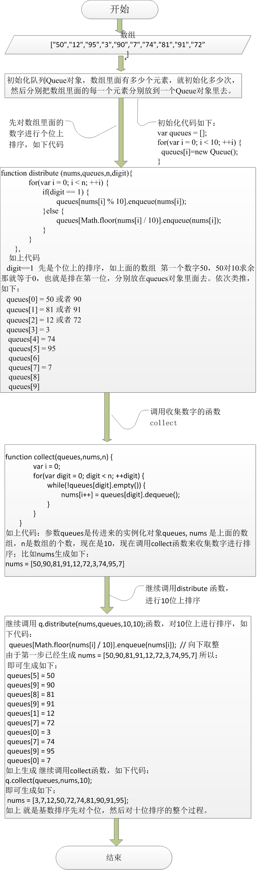 由于上面省略了很多步骤,可能描述的不是很清楚,我们现在先来看看流程图,结合流程图,最后结合JS的所有代码就可以理解"基数排序的"基本原理了;下面我们可以看看如下的流程图;