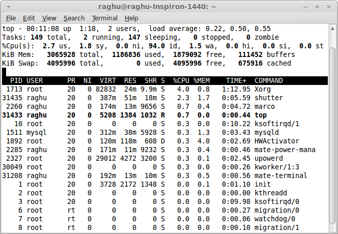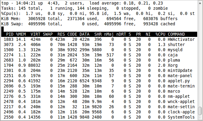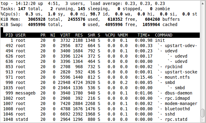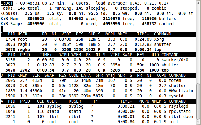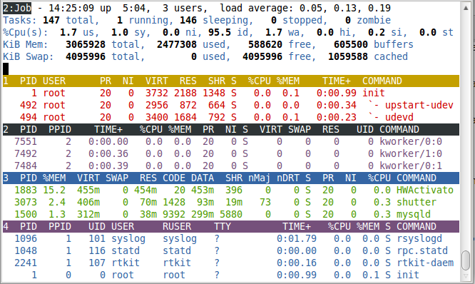 前几行水平显示了不同系统参数的概括,接下来是进程和它们在列中的属性。