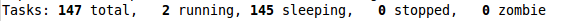 第二行显示的是任务或者进程的总结。进程可以处于不同的状态。这里显示了全部进程的数量。除此之外,还有正在运行、睡眠、停止、僵尸进程的数量(僵尸是一种进程的状态)。这些进程概括信息可以用't'切换显示。