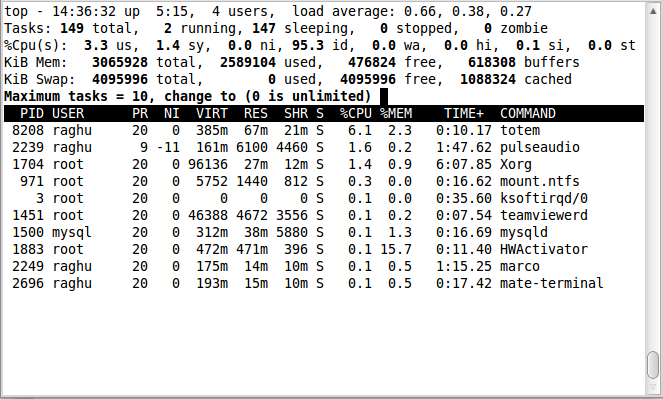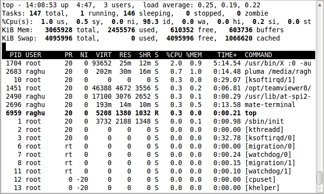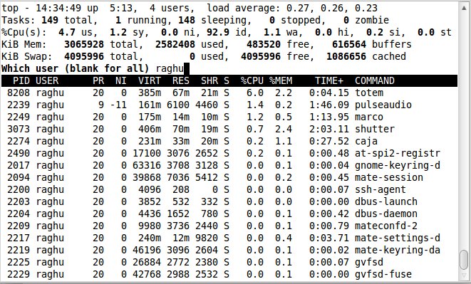 $ top -p 28453 -u raghu