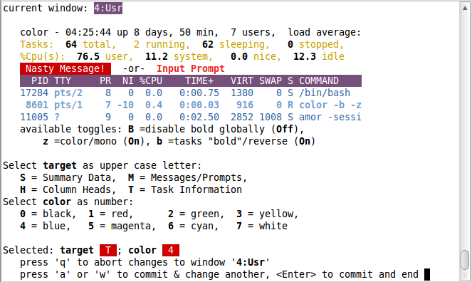 按下'Z'向用户显示一个改变top命令的输出颜色的屏幕。可以为8个任务区域选择8种颜色。