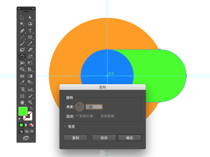 5、选中绿色胶囊,按R键启动(旋转)功能,再按ALT+左键,点击参考线交叉的圆形,跳出旋转面板,输入120°后点复制。