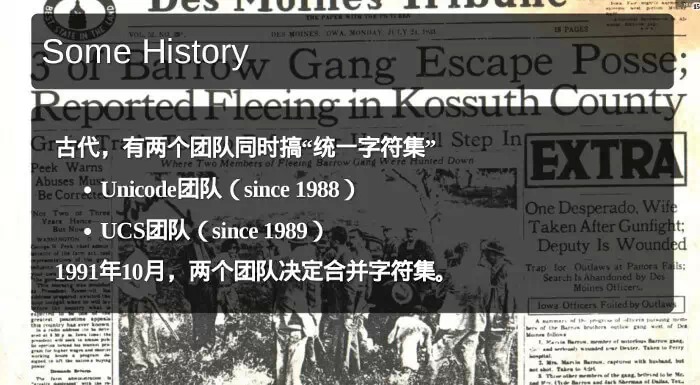 互联网还没出现的年代,曾经有两个团队,不约而同想搞统一字符集。一个是1988年成立的Unicode团队,另一个是1989年成立的UCS团队。等到他们发现了对方的存在,很快就达成一致:世界上不需要两套统一字符集。