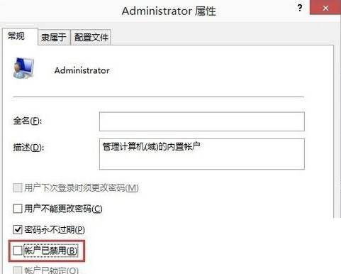 5、在右侧双击打开“Administrator”,将【账户已停用】前面的勾去掉,点击应用并确定;