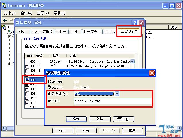 B 运行IIS Admin,如图,对需要rewrite的网站做相应设置。在自定义错误选单中,找到“404”错误的选项,编辑其属性,设置消息类型为:URL(重要,必须设置为URL,否则将导致服务器对不存在的页面给出404响应,而设置为URL后,rewrite后的页面的HTTP响应为正常的200)。地址设置为 /iisrewrite.php。