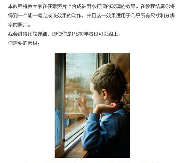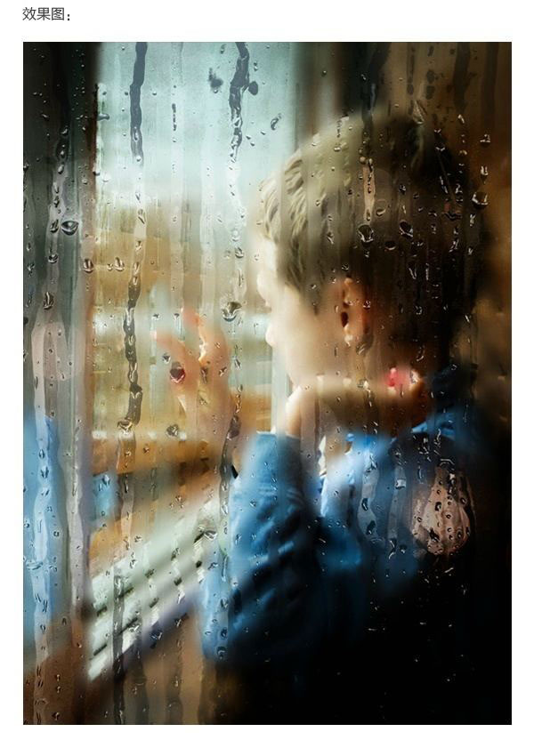 本教程以使用ps给望向窗外的男孩照片添加玻璃雾气效果为例,教大家在任意照片上合成被雨水打湿的玻璃的效果,也就是我们所说的玻璃雾气效果。在教程结尾你将得到一个能一键完成该效果的动作,并且这一效果适用于几乎所有尺寸的分辨率的照片。