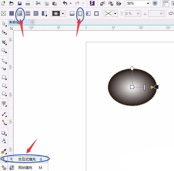 2、单击“交互式填充”工具,属性栏中选“渐变填充”选“椭圆渐变”单击黑色小方框后选红色,效果如图: