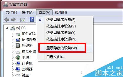 如果你的电脑系统是Windows 7或XP,首先需要进入设备管理器,点击菜单栏选择“查看→显示隐藏的设备”。