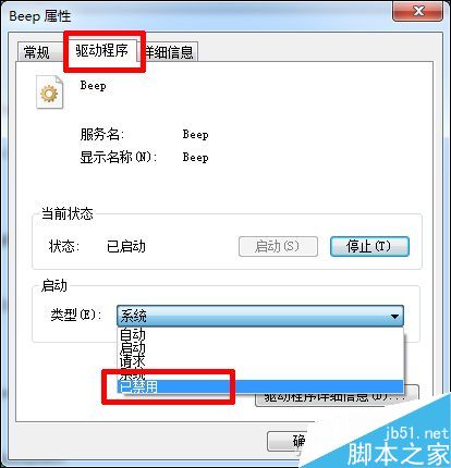 如果是Win7系统,则需要双击“beep”进入属性界面,在驱动程序选项卡中将“启动”类型设定为“停用”。