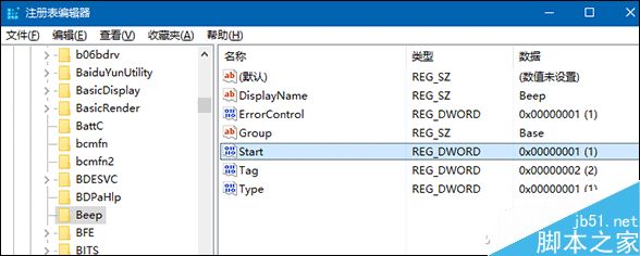 按“Win键+R”执行“regedit”进入注册表编辑器,定位到“HKEY_LOCAL_MACHINE\SYSTEM\CurrentControlSet\Services\Beep”位置,点击“beep”,在右边找到“start”并双击打开它。