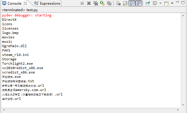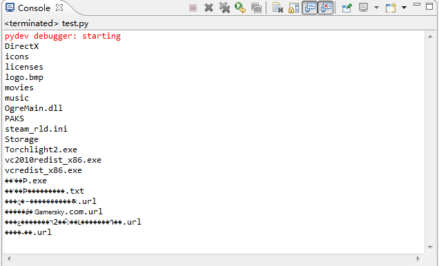 代码很简单我们使用os的listdir函数遍历了E:\Torchlight II这个目录(Torchlight ?! :)),由于这个目录下有些文件是以中文命名的,所以在最后print结果时出现了乱码,像这样: