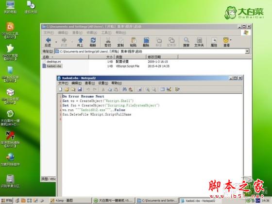 图24 大白菜在开始菜单启动项添加的VBS文件及其内容