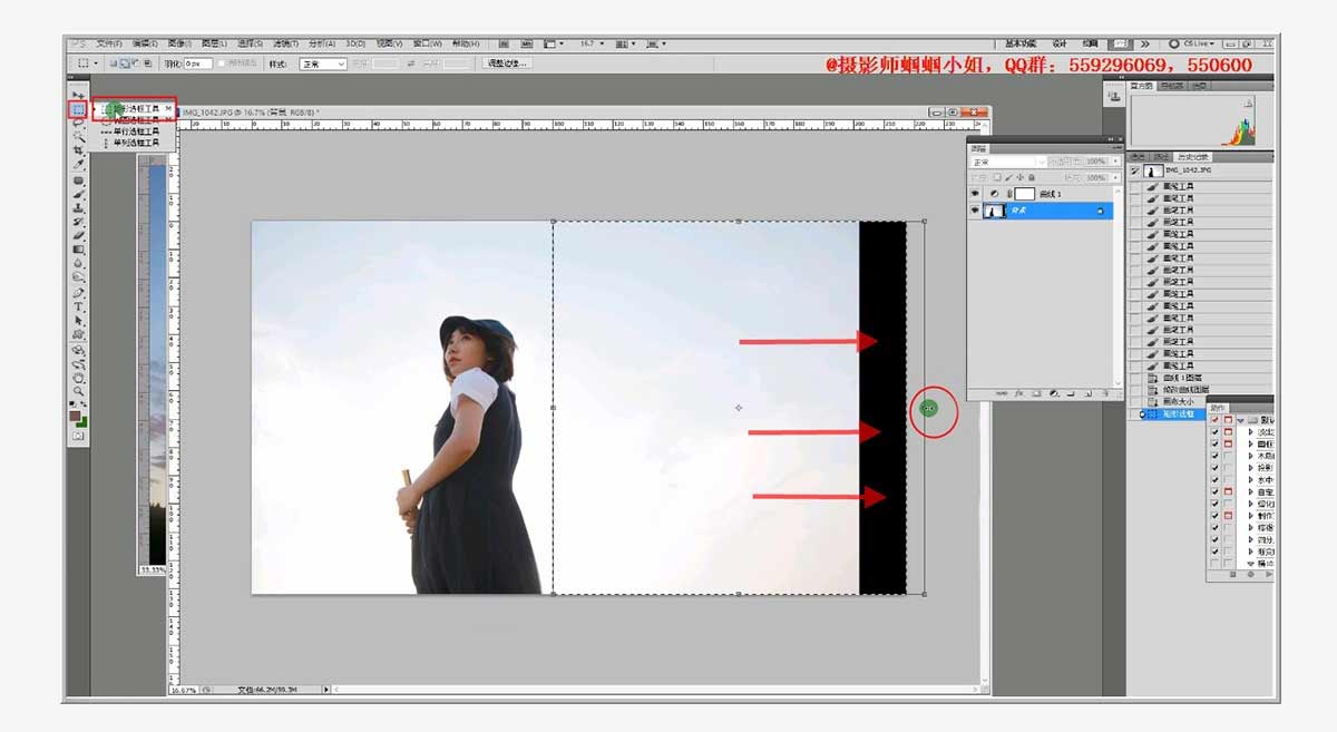第二步:为了使天空的区域更广,更好的融合天空素材,需要改变照片构图,找到 【图像】中【画布大小】增加右边区域,设置宽度为218,使用【矩形选框】选择右边一块区域,【ctrl+t】自由变换往右边拉,改变右边构图之后,使用同样的方法改变高度大小,当然这个都是因人而异,以上数据仅供参考。