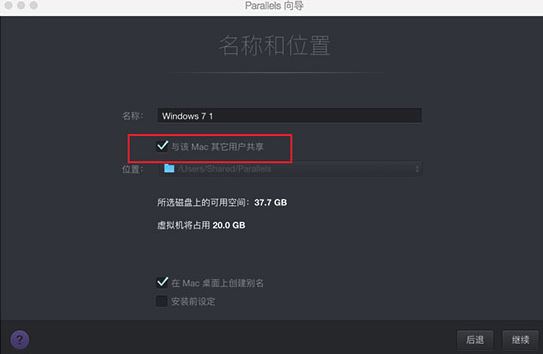 在“名称和位置”这一步骤中勾选“与该Mac其它用户共享”,这样新的虚拟机将自动放置在/Users/Shared/Parallels目录中,并会向此计算机的所有用户授予一切必要权限。