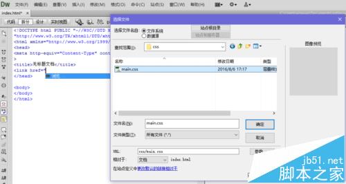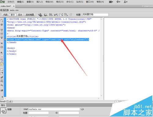 4、而后输入一般性代码:<link href="css/main.css" _fcksavedurl=""css/main.css"" type="text/css" rel="stylesheet"/>