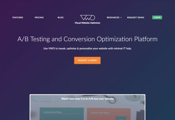 VWO用对比色“黄色”吸引用户去体验产品demo。